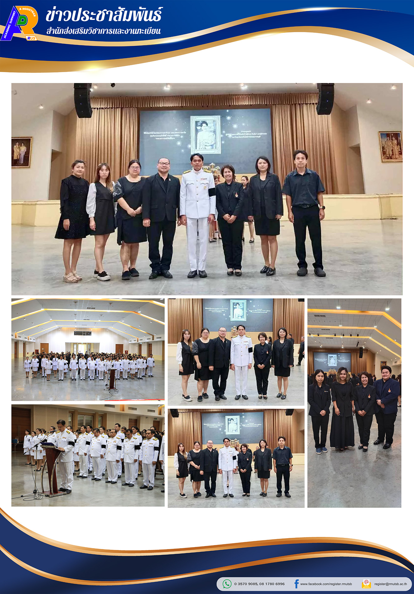 เมื่อวันศุกร์ที่ 31 ตุลาคม 2568 ผู้ช่วยศาสตราจารย์ ดร.ธนาพล สุขชนะ ผู้อำนวยการ พร้อมด้วยผู้บริหารและบุคลากร สำนักส่งเสริมวิชาการและงานทะเบียน ร่วมพิธี น้อมสำนึกในพระมหากรุณาธิคุณและแสดงความอาลัย ต่อสมเด็จพระนางเจ้าสิริกิติ์ พระบรมราชินีนาถ พระบรมราชชนนีพันปีหลวง จัดขึ้น ณ หอประชุมพระพิรุณ–ระลึกโปรดเกล้าฯ มหาวิทยาลัยเทคโนโลยีราชมงคลสุวรรณภูมิ ศูนย์พระนครศรีอยุธยา หันตรา เพื่อรำลึกในพระมหากรุณาธิคุณอันหาที่สุดมิได้ และสดุดีพระเกียรติคุณของพระองค์ผู้ทรงเปรียบเสมือน นางฟ้า ที่คอยดูแลและให้ พระเมตตา แก่ปวงชนชาวไทยมาโดยตลอด