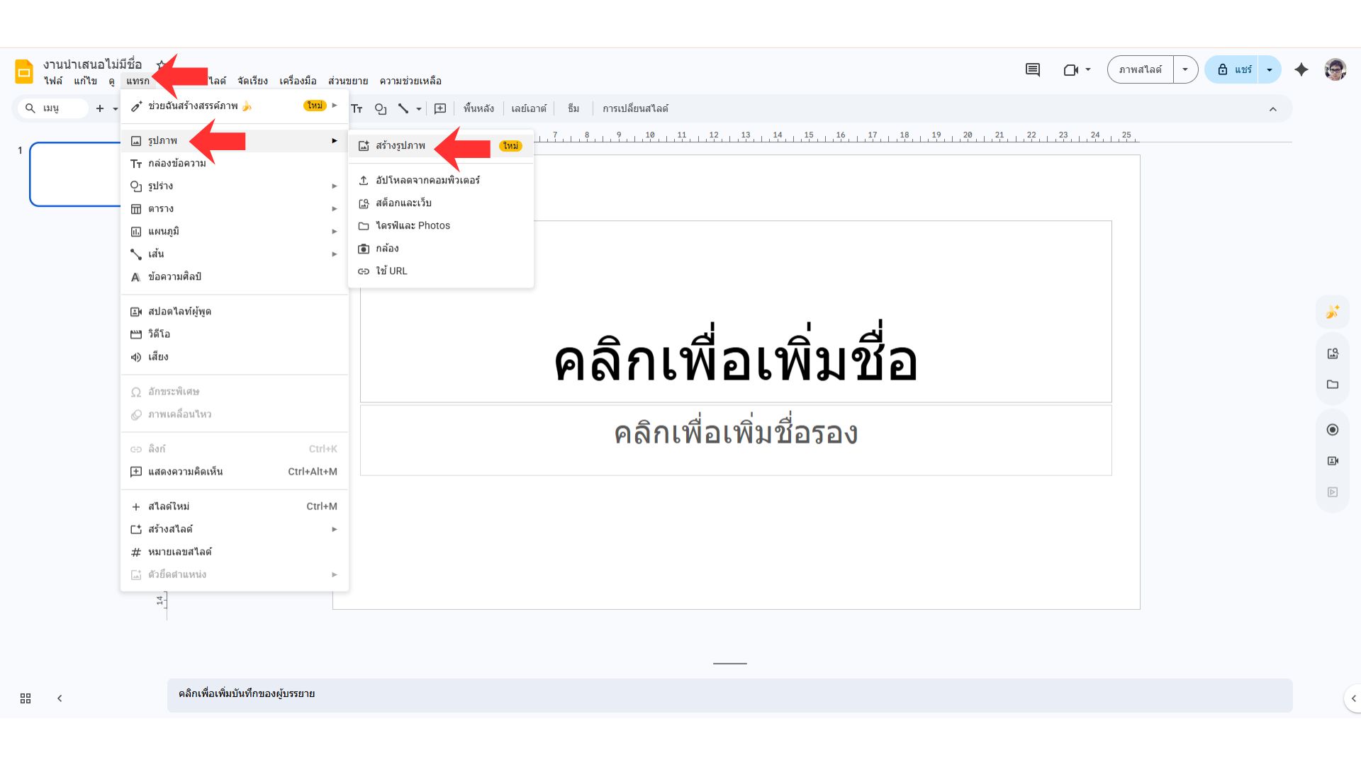 2. เลือกเมนู “แทรก” และเมนูย่อย “รูปภาพ” และเลือก “สร้างรูปภาพ”