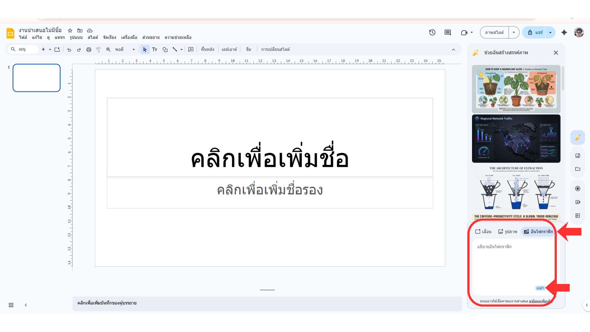 3.เลือกรูปแบบเป็น “อินโฟกราฟิก” จากนั้นพิมพ์ Prompt รูปภาพที่ต้องการให้ AI สร้างขึ้นมาในช่องพิมพ์ และกดปุ่ม